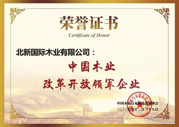 2019年,北新木业在参与组建多个行业创新联盟,制定行业国家标准等方面作出了突出贡献,荣获“中国木业改革开放领军企业”、“中国林产工业30周年突出贡献奖”、“无醛人造板国家创新联盟发起单位”等称号。