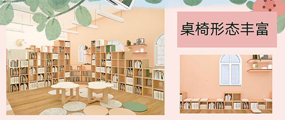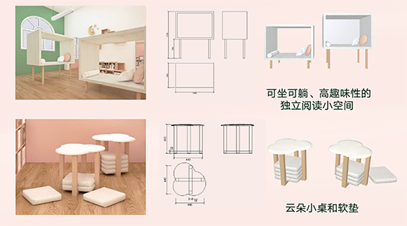 再加入走心的个性化设计:可坐可躺的独立阅读空间、可爱的云朵小桌和软垫,满足上课、存书、借阅等基本功能的同时,更满足了孩子们的探索心和好奇心。